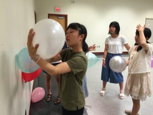 まずはホストファミリーの座席にカラフルなペンを使って座席表を作ったり、入り口に置くパーティ会場の看板を作ったり、ステージとなる壁にはカラフルな風船を膨らまして、ハート形に風船で壁に飾りつけをしました。