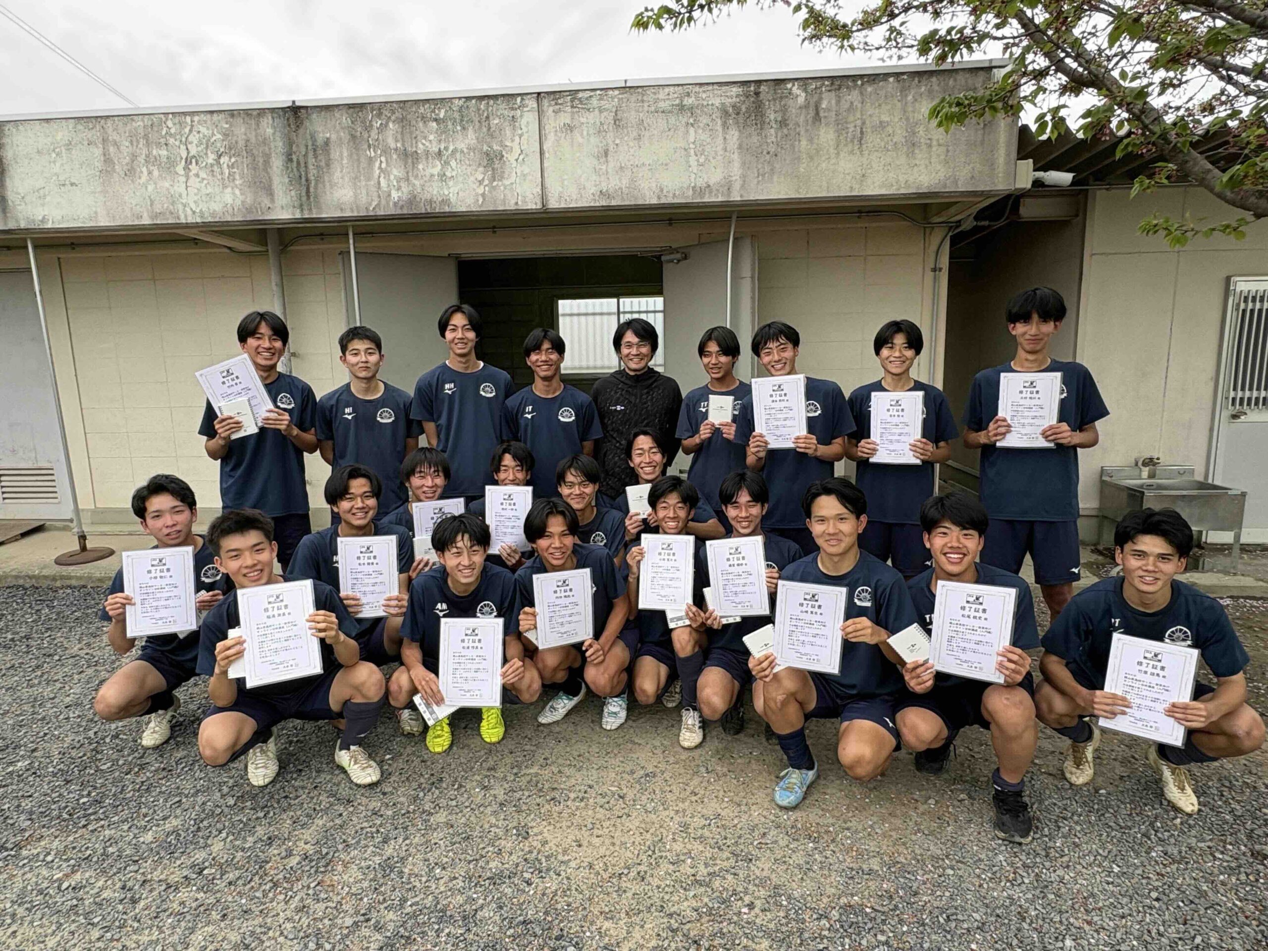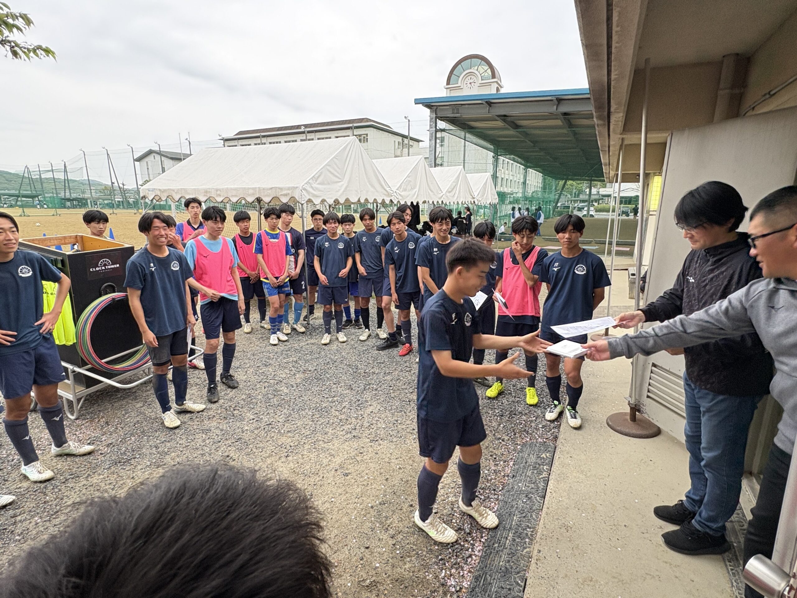県内の100名を超える高校生がこの分析講座に申し込み、各回の動画視聴と課題提出を全て完了した生徒が19名だったそうです。19名のうち18名が岡山城東高校サッカー部の生徒だったこともあり、分析講座を主催された一般財団法人岡山県サッカー協会技術委員会TSG室⻑の久永啓さん(岡山理科大学経営学部経営学科准教授)が本校に直接来校され、選手一人ひとりに受講修了証を手渡してくださいました。最後までやり抜いた継続力に対して、久永さんより温かい激励の言葉をいただきました。