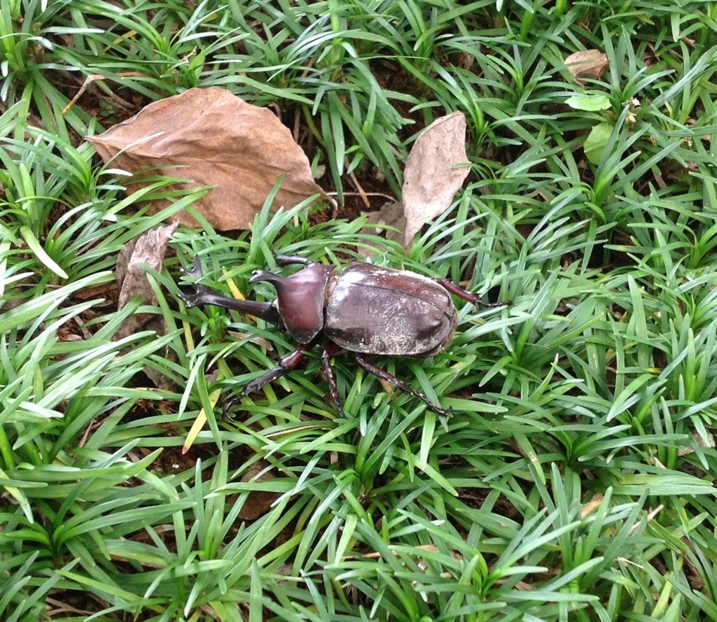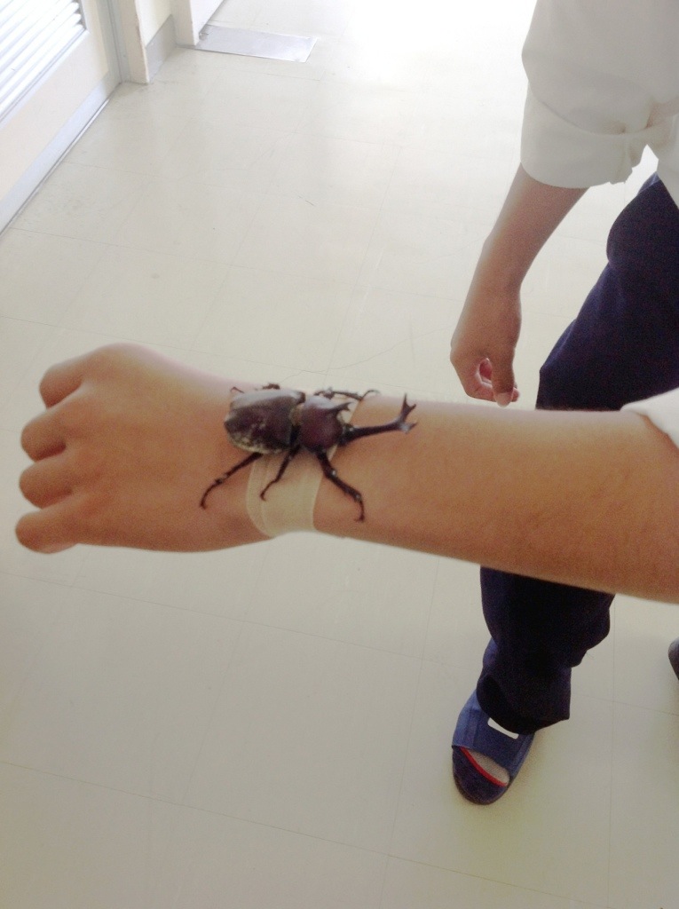 と、いう訳で 昨日のトンボに対抗したのか カブトムシが教室にいました。