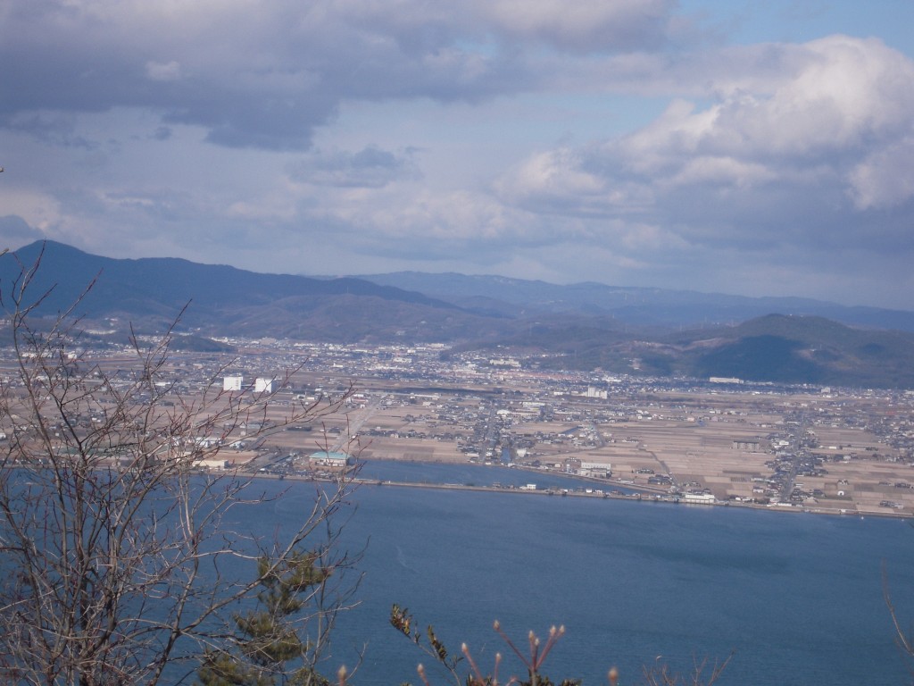 貝殻山から北を見た景色です。百間川の河口が見えます。山の手前に見える平野は江戸時代に干拓されたところなので、当時は今より海は広い状態でした。この海域を、かつては「吉備の穴海」と呼んでいました。貝殻山の集落が、内海航路を監視する役割を果たしていたとするならば、むしろ北側に、より多くの目が注がれていたに違いありません。