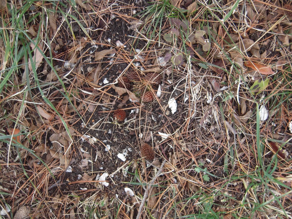 画面中央の、道に面した斜面に貝塚があります。以前は説明用の看板がありましたが、今はありません。そのせいか、貝塚に気づく人は少ないようです。現在は草に覆われていますが、それでも、ハイガイ、カキ、小さな巻き貝などを確認できます。貝塚はゴミ捨て場なので、役に立たなくなったものが堆積しています。掘り返しても骨董品的な価値のあるものは出てきません。でも、ゴミ捨て場でも、研究者にとっては、当時の生活を解明する上で貴重な資料です。この状態のままでじっくり観察をお願いします。目をこらすと、土器片や石器片も見つかるでしょう。