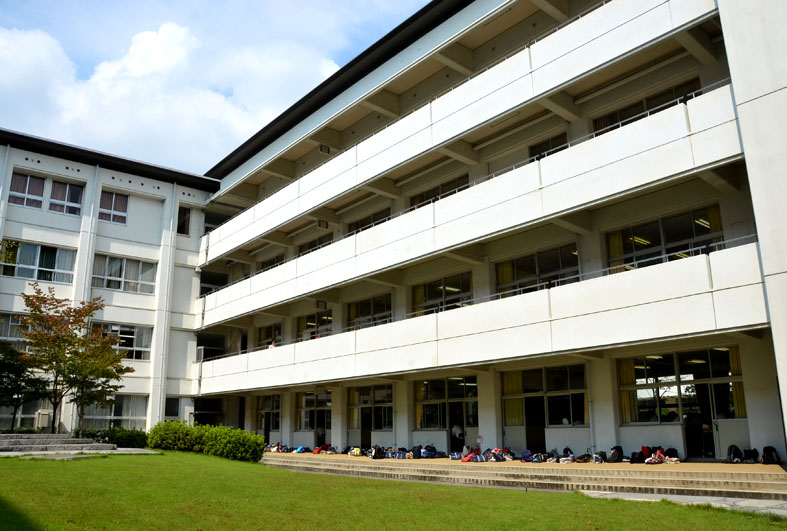 3年次生の教室がある 2棟を芝生中庭よりながめました